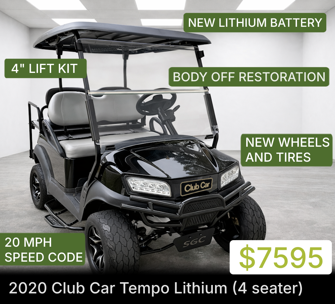 If you want a cart that is golf-ready, this one is for you. 2020 Tempo with all aluminum frame. This cart was outfitted with stock premium seats and a Club Car bluetooth in-roof stereo. Upgraded wheels and tires and a new 48v lithium battery.